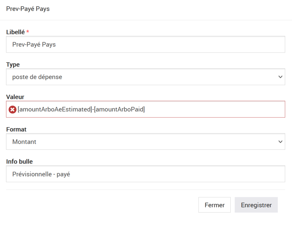 | Prévu__moins__Engagé_payé_arbo | Prévu – engagé/payé (arbo) | Reste par poste |