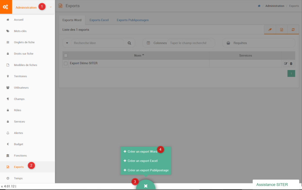 En bas à droite, cliquez sur le bouton vert (3) pour faire apparaître le menu contextuel, puis sélectionnez Créer un export Word (4).