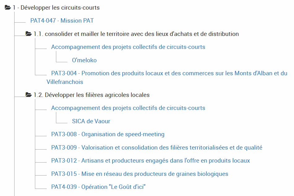Ce mode combine la hiérarchie des mots-clés ou référentiels avec les fiches qui leur sont rattachées. Chaque niveau du référentiel (parent, nœud, feuille) peut agréger les données des fiches associées, par exemple pour afficher un total budgétaire ou un résumé synthétique.