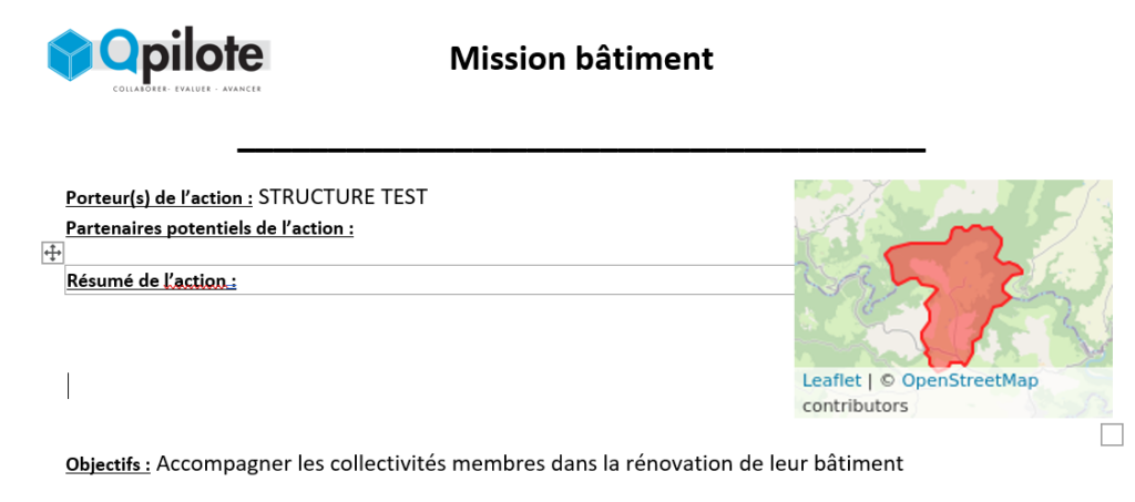 Le module d’export Word de QPILOTE permet de générer automatiquement des documents structurés à partir des fiches du logiciel. Cette fonctionnalité est utilisée pour produire des bilans annuels, des rapports d’activité, des suivis de programmes d’action, ou des rapports d’évaluation. Chaque export dispos ainsi de sa mise en forme et de son contenu pour répondre aux besoins spécifiques de chaque rapport.