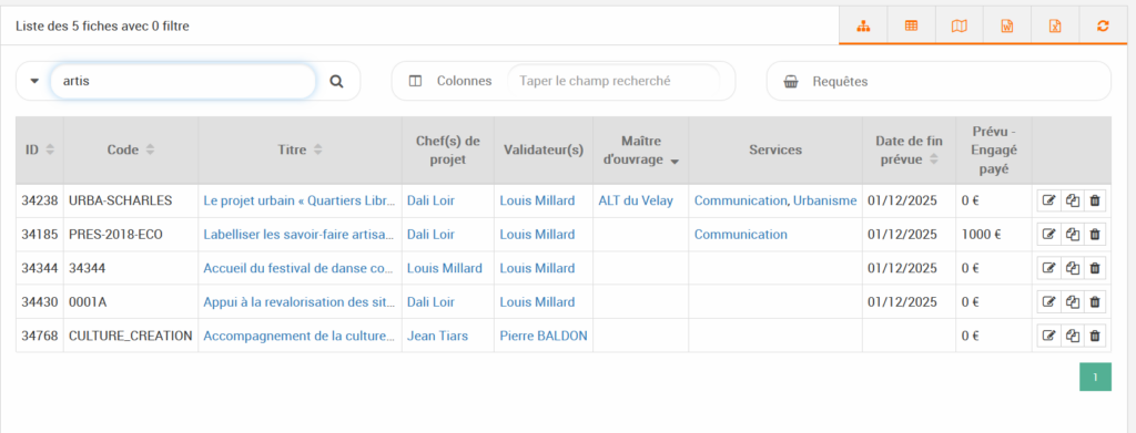 • Pour retrouver rapidement une fiche : privilégier le code projet ou un mot distinctif de l’intitulé.